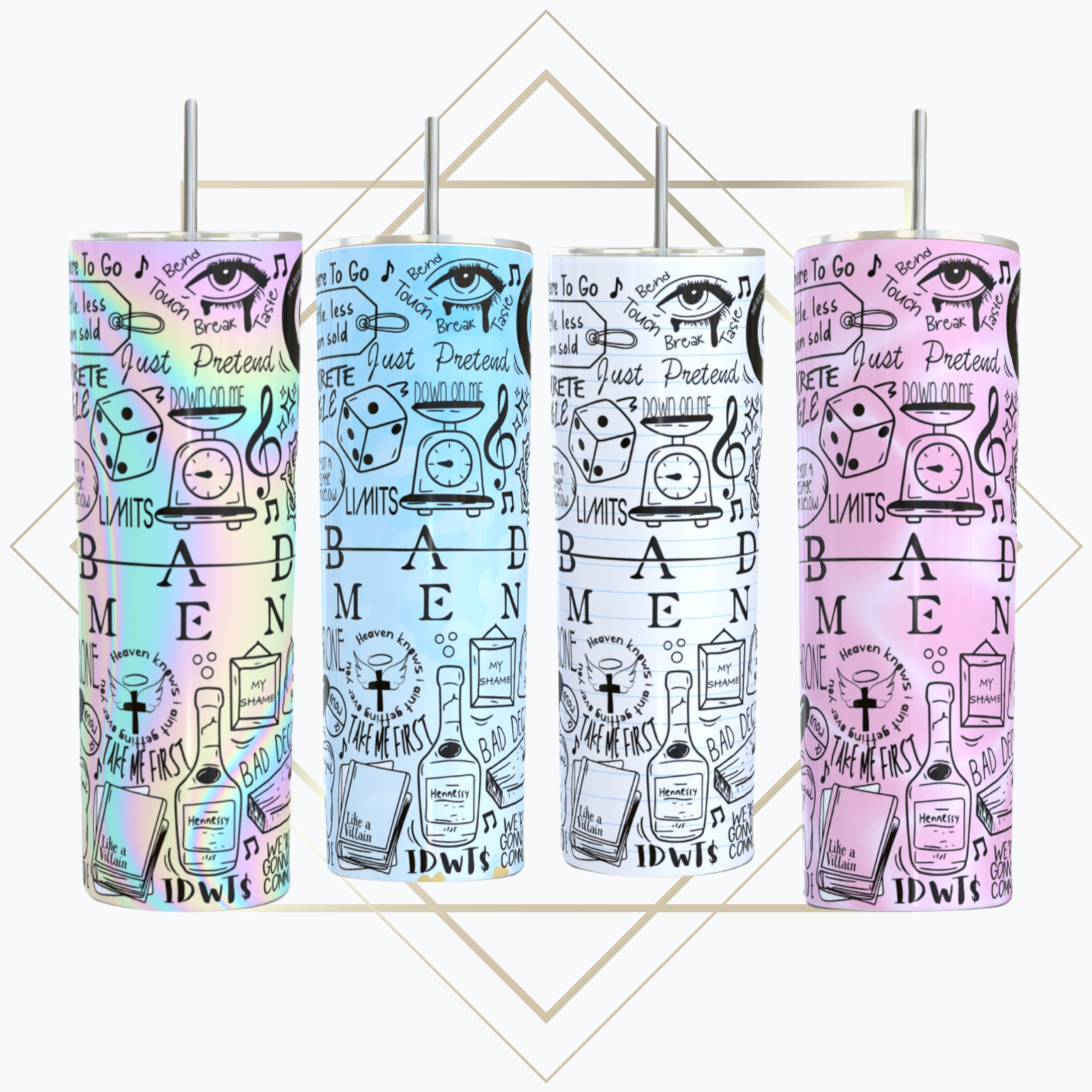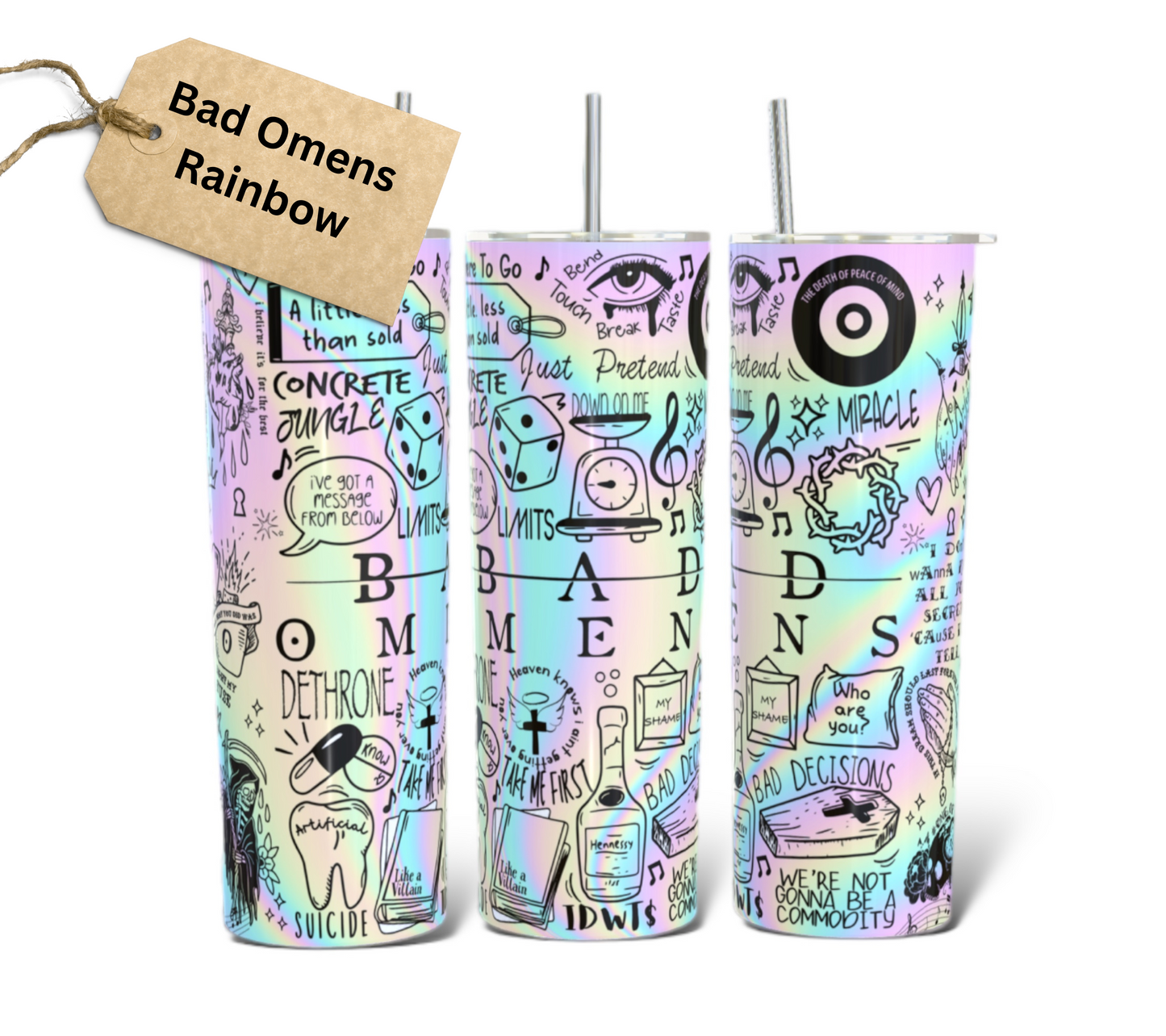 Introducing the 20oz Bad Omens tumbler/mug set, featuring a stainless steel edition with a variety of eye-catching designs. Choose from options like the pastel rainbow foil, Luxury pink or blue, or a lined book doodle aesthetic. Whether you prefer the portable and insulated tumbler for on-the-go adventures or the stylish mug for home and office use, this set caters to both your taste and lifestyle. Embrace your love for Bad Omens with these functional and visually appealing drinkware options.