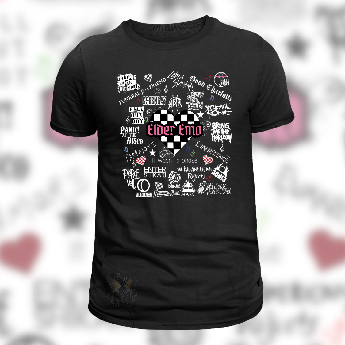 Get ready to reminisce and revive your inner emo spirit with our exclusive collection of tee shirts featuring an iconic Elder Emo checkered heart!