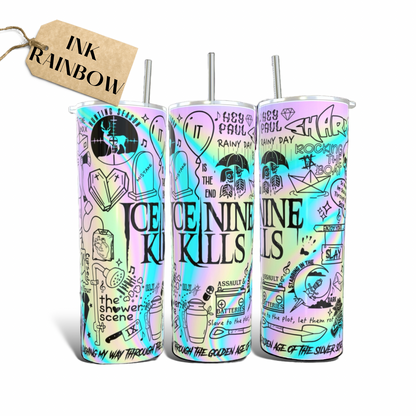 Introducing the 20oz Ice Nine Kills tumbler Choose from options like the rainbow, Bloodbath, subtle white or a teal gore aesthetic, added printed pink glitter, each design is a hand drawn doodle theming each song or album